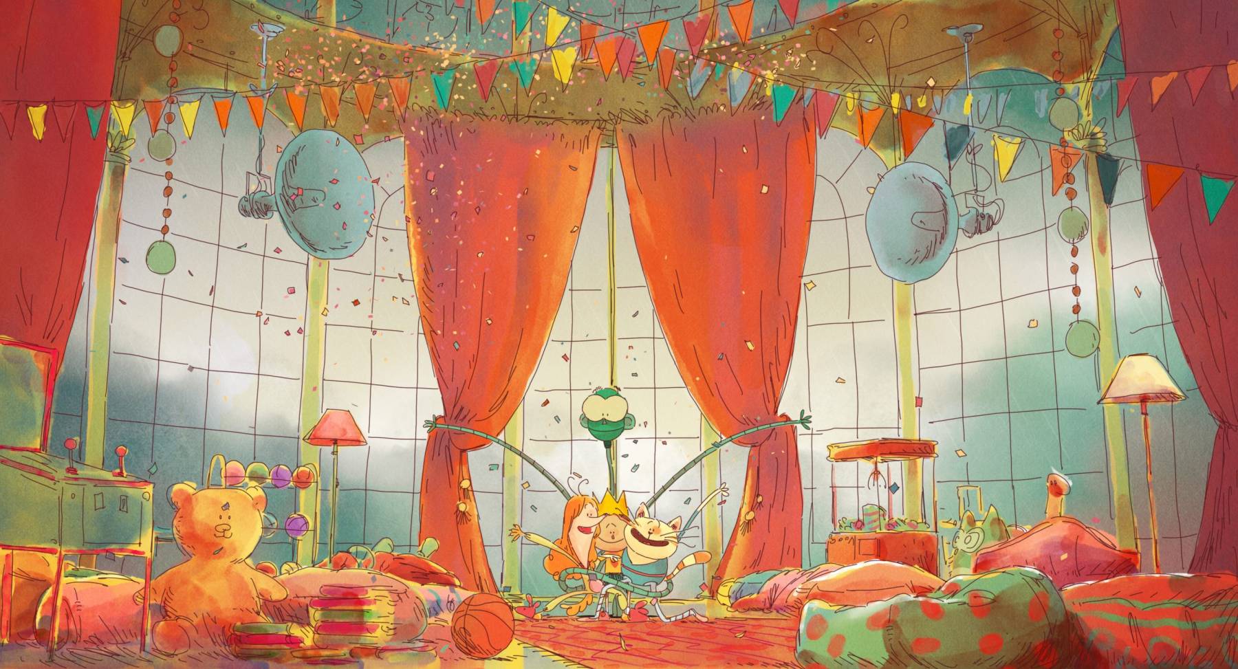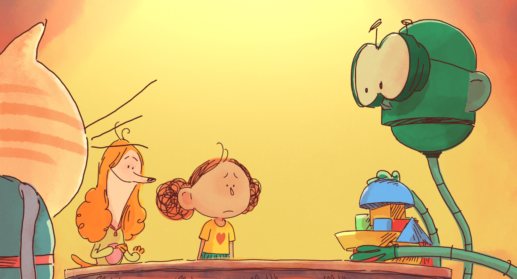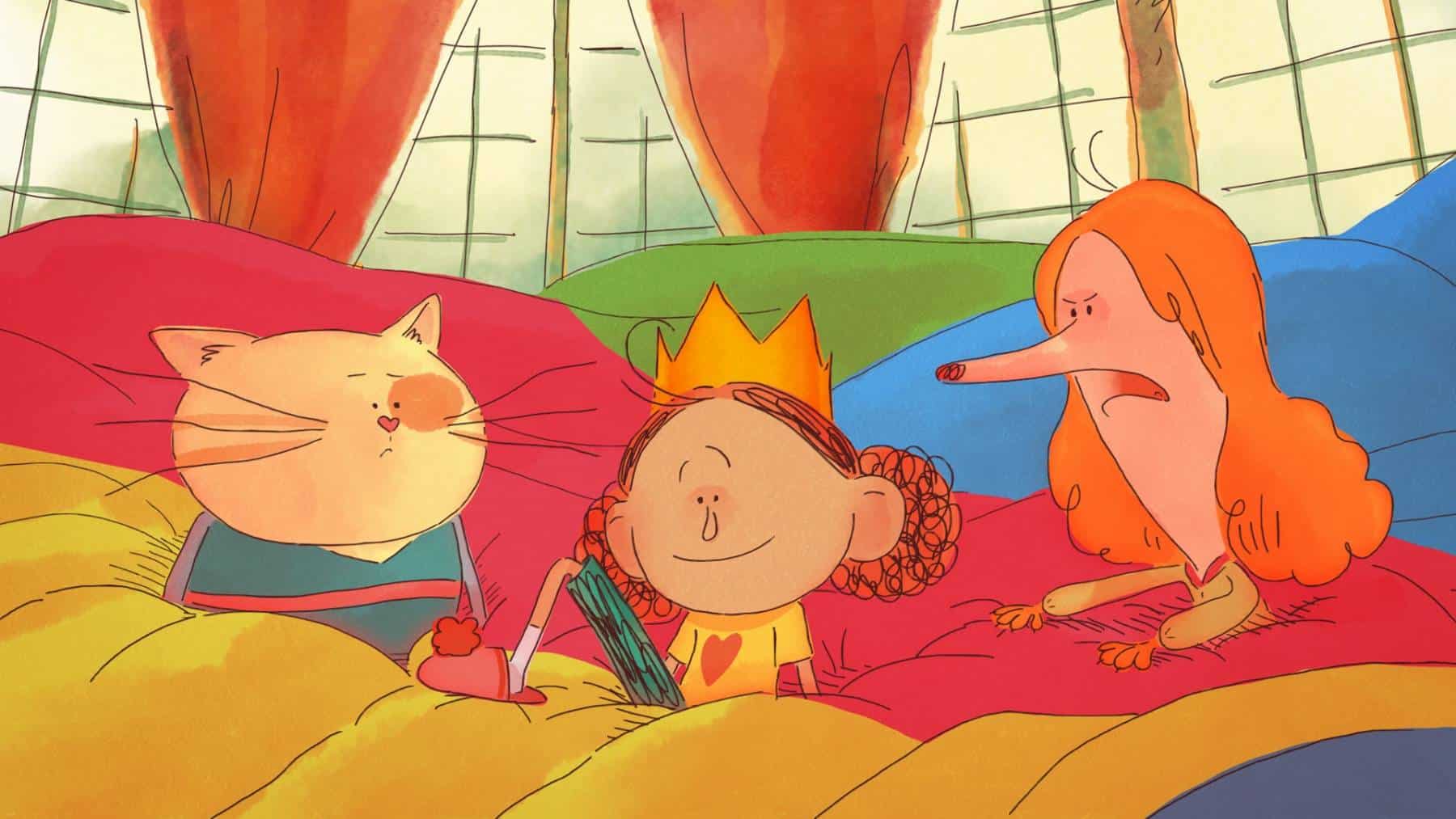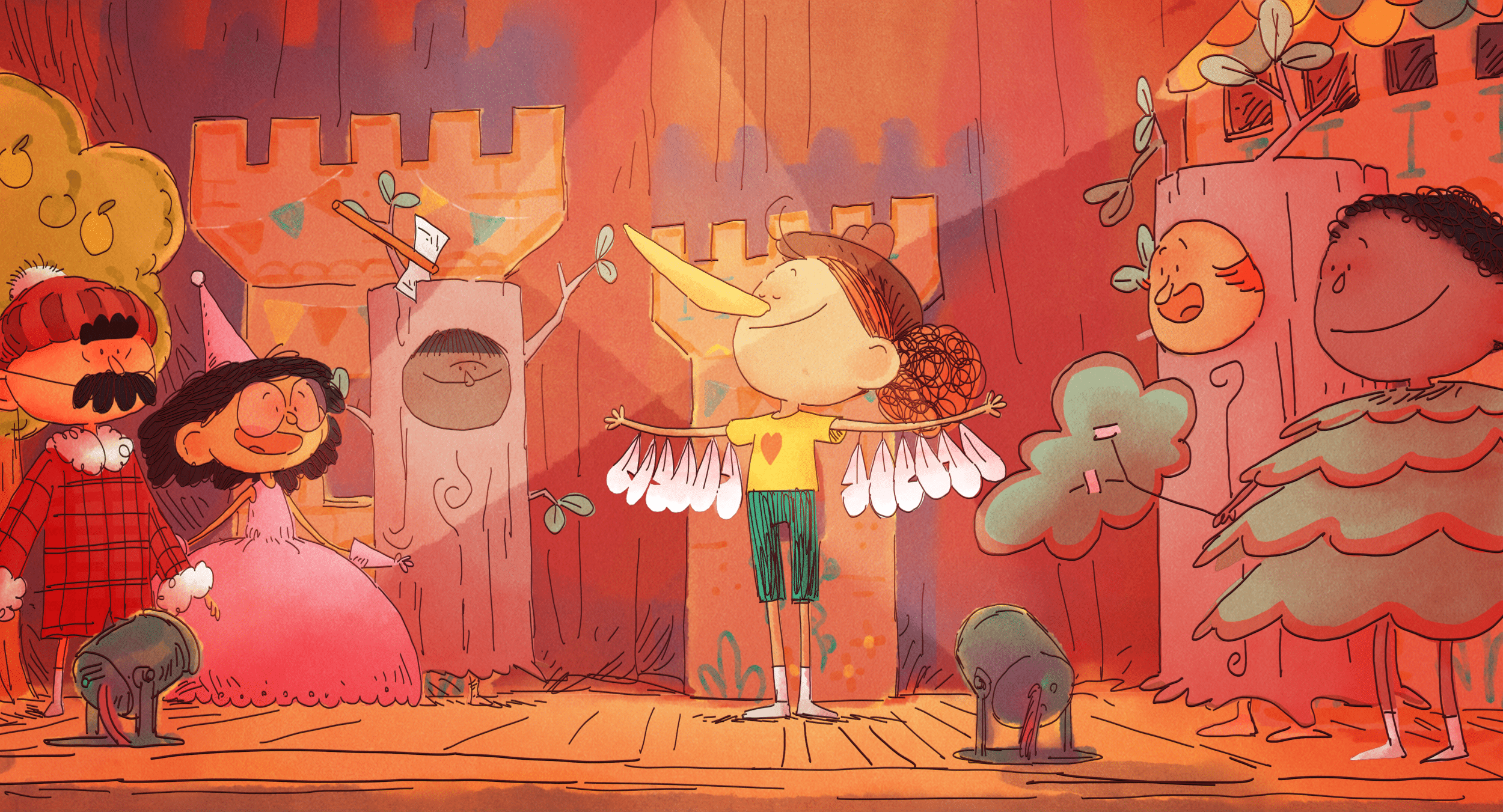 Alors que le spectacle de l’école va commencer et que les applaudissement du public résonne, Andréa n’ose pas rejoindre ses camarades sur scènes. Pour se cacher, elle file s’enrouler dans une cape de fortune dont le tissu semble semble interminable. Elle en ressort finalement dans un magnifique palais, entouré d’un nuage aussi moelleux qu’impénétrable.